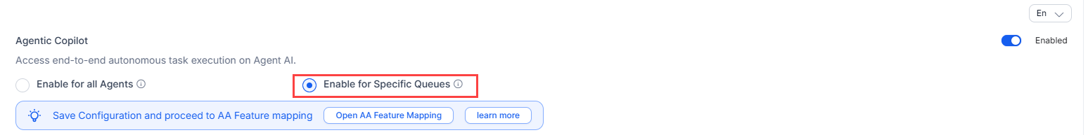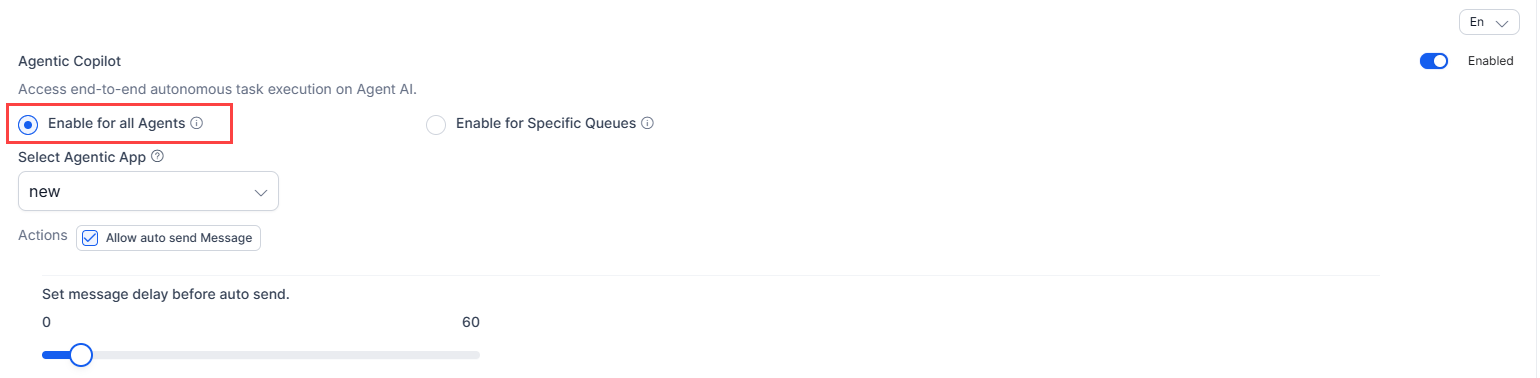 Agentic Copilot: The Agentic Copilot feature enables you to have autonomous, end-to-end task execution. Agents monitor the conversations and can cancel, override, or edit the messages. In this section, you can select a language, enable/disable this feature, select the Enable for all Agents or Enable for Specific Queues option, select an app, select to auto send messages, and set a timer (up to 60 seconds) for auto sending messages.