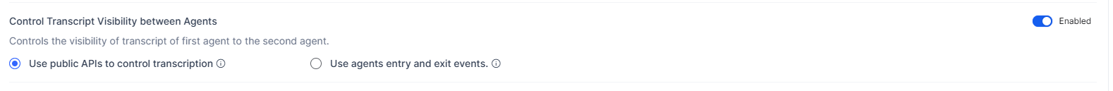 Control Transcript Visibility between Agents (for Voice channel): This feature, available only for the Voice channel, restricts transcript visibility to the current agent. Visibility can be managed using public APIs or agent entry/exit events, except in warm transfers/conference calls where all participants can view shared transcripts. The following options are available: