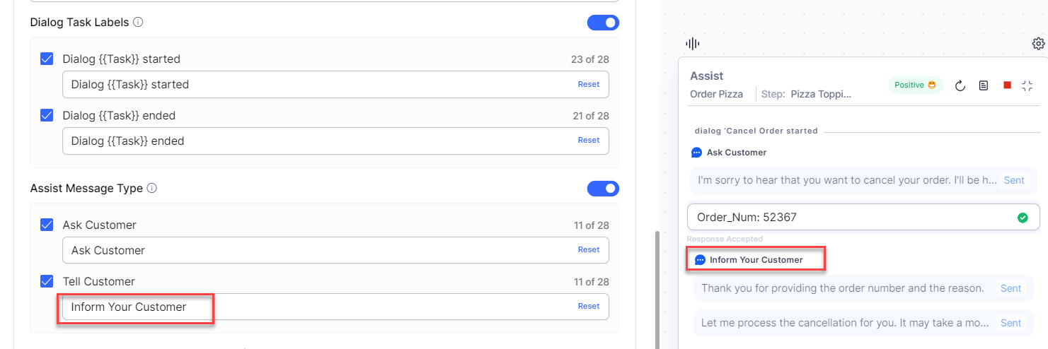 Here, you can customize the Assist message type displays and labels. You can disable this entire section by using the “toggle” button at the top, or enable or disable either or both the Ask Customer or Tell Customer labels. In the following screenshot, the Tell Customer label has been renamed as Inform Your Customer.