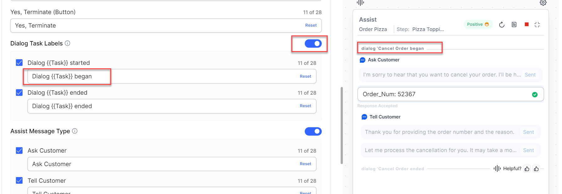 Note that both the Dialog {{Task}} started and Dialog {{Task}} ended labels have a limit of 28 characters each. Click Reset to go back to the default label names.