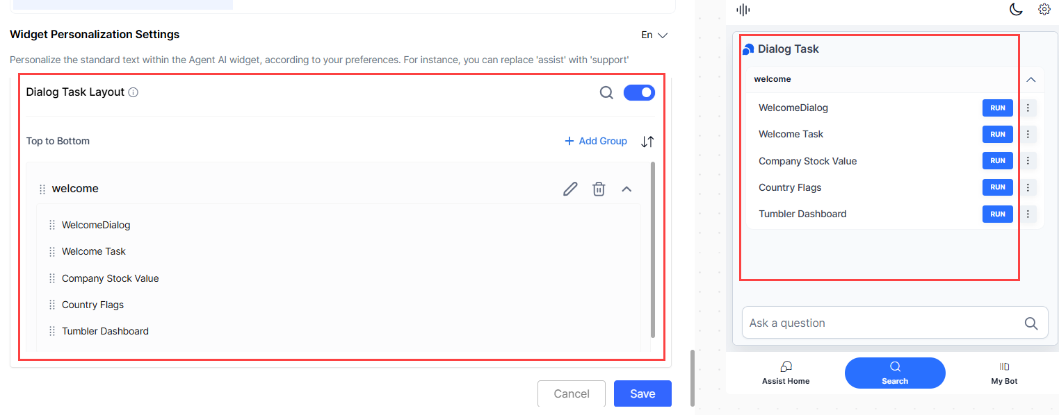 The Dialog Task Layout section enables you to enhance the management and customization of dialog tasks within the widget. Here, you can arrange and group dialog tasks to display in the Library during runtime. Dialog tasks not added to a group don’t appear at runtime. The key features of this section are: