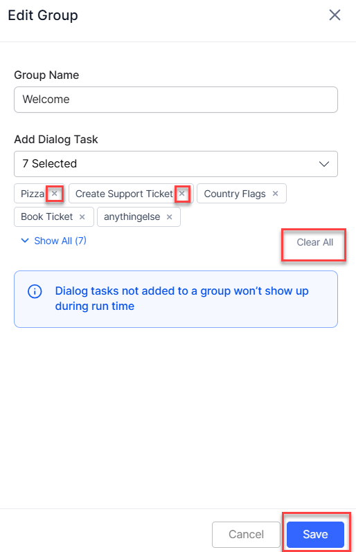 This feature allows you to organize dialog tasks into groups. During group creation, up to five selected dialog tasks are displayed, with additional dialog tasks visible if Show All is clicked. Group names must be unique. A single dialog task can be associated with multiple groups. You can add, edit, and delete groups, as well as add, sort, and remove dialog tasks within a group.