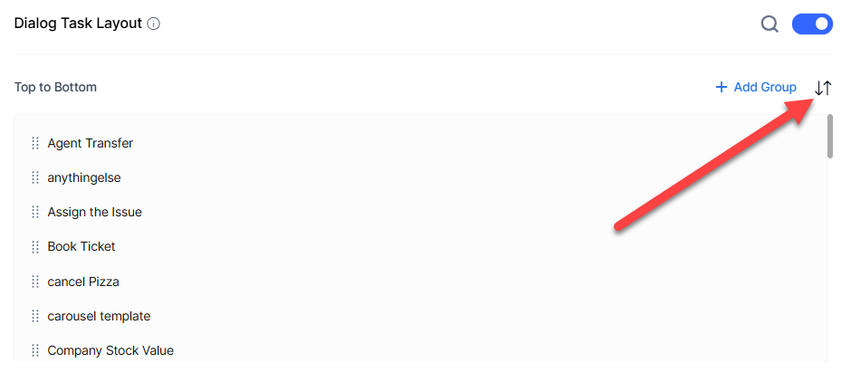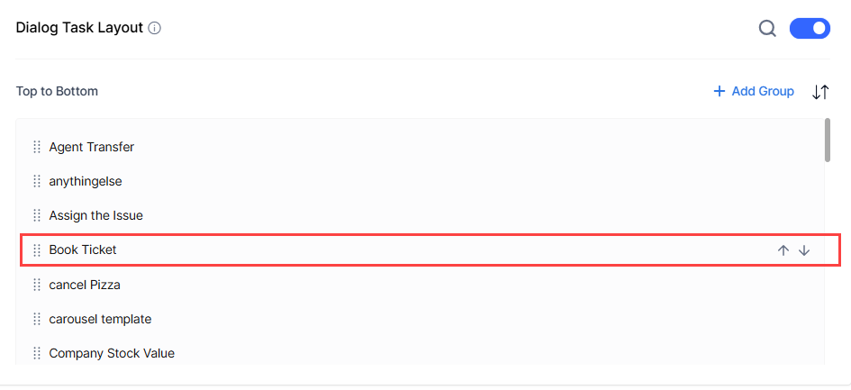 - To sort the dialog tasks alphabetically or reorder them, click the up and down arrows at the right-top corner of the Dialog Task Layout page and the arrows against the dialog task.