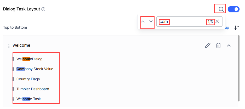 - Enter a few letters of the dialog task name. As you enter the letters, matching letters in the existing dialog tasks are highlighted, with the number of occurrences. Up and down arrows also appear to let you easily navigate to the intended dialog task. The following screenshot shows the search result of the letters com along with the occurrence count and navigation arrows: