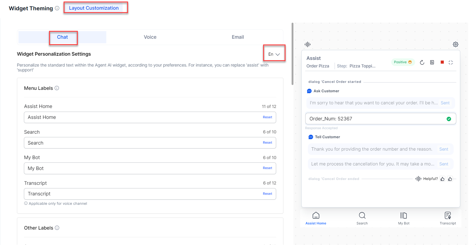 Agent AI now enables channel-specific widget customization, letting users modify the widget's layout as required. As you customize the widget, you can preview the changes on the right half of the page.