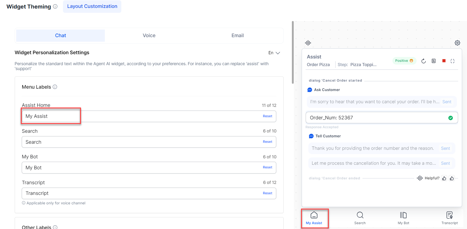 In this section, you can customize all the widget menu names. The standard menu names are Assist Home, Search, My AI Agent (Bot), and Transcript (for Voice channels). As you modify the menu names on the left side of the page, you can preview your changes on the right side. In the following screenshot, Assist Home has been modified to My Assist:
