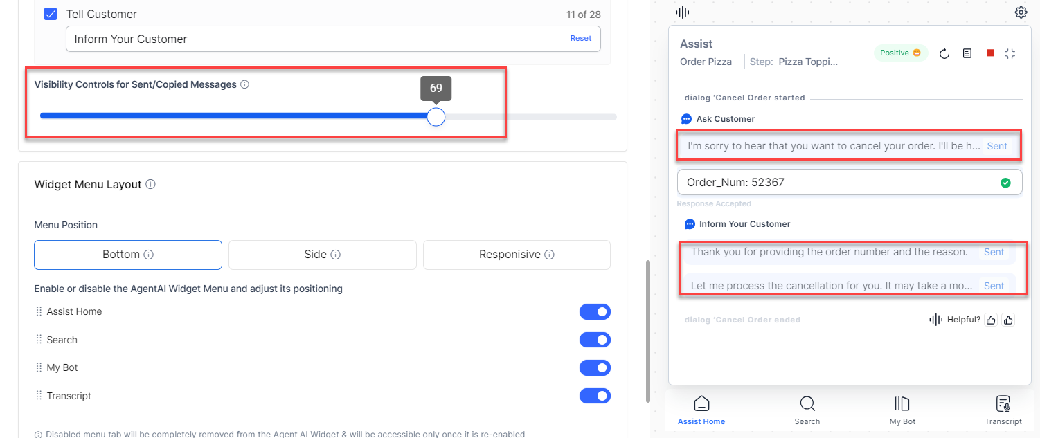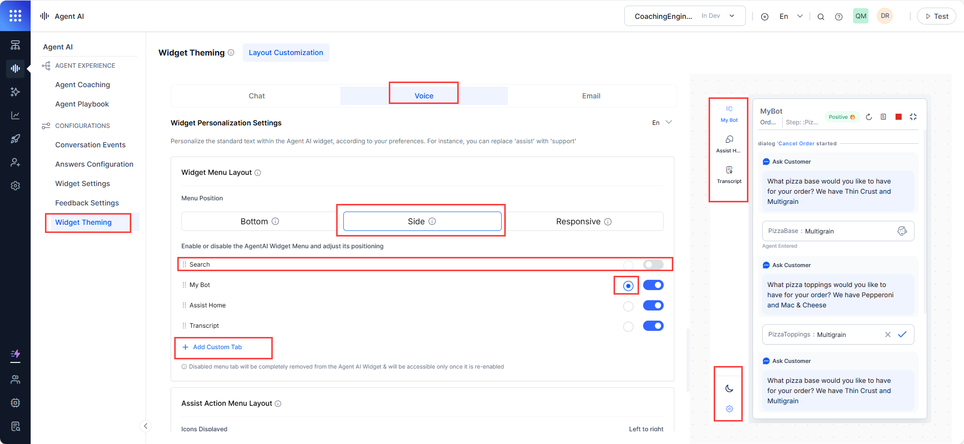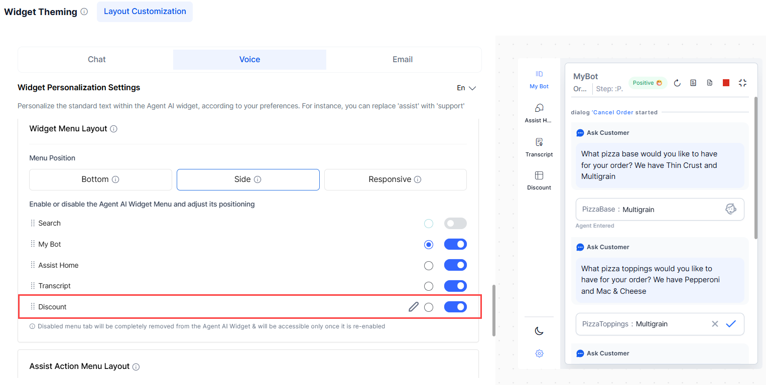 This section lets you enable or disable the Agent AI widget menus - Assist Home, Search, My AI Agent (Bot), and Transcript (for the Voice channel). The disabled menus appear on the widget, only if you enable them back. It also lets you select a landing tab and create a custom tab (+ Add Custom Tab). You can position the menus at the bottom or the side by clicking the Bottom or Side options at the top or shuffle the menus with the drag-and-drop action. To automatically position the menus based on the pixel level, select the Responsive option; If the pixel size is less than 600, the menus move to the bottom, and for more than 600, the menus move to the left. The following screenshot shows a disabled Search menu, Side positioning of the enabled menus, My AI Agent (Bot) tab marked as the landing tab, shuffled Assist Home menu with the My AI Agent (Bot) menu, and the + Add Custom Tab button: