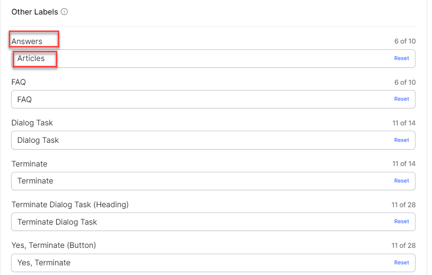 Similarly, you can modify the other labels like FAQ, Dialog Task, Terminate, Terminate Dialog Task (Heading), and Yes, Terminate (Button). Note that the Answers and FAQ labels have a limit of 10 characters, Dialog Task and Terminate have 14, and Terminate Dialog Task (Heading) and Yes, Terminate (Button) have 28. Click Reset to go back to the default label name.