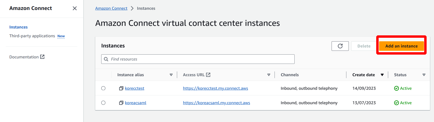 Click Add an instance to create a new Amazon Connect instance.