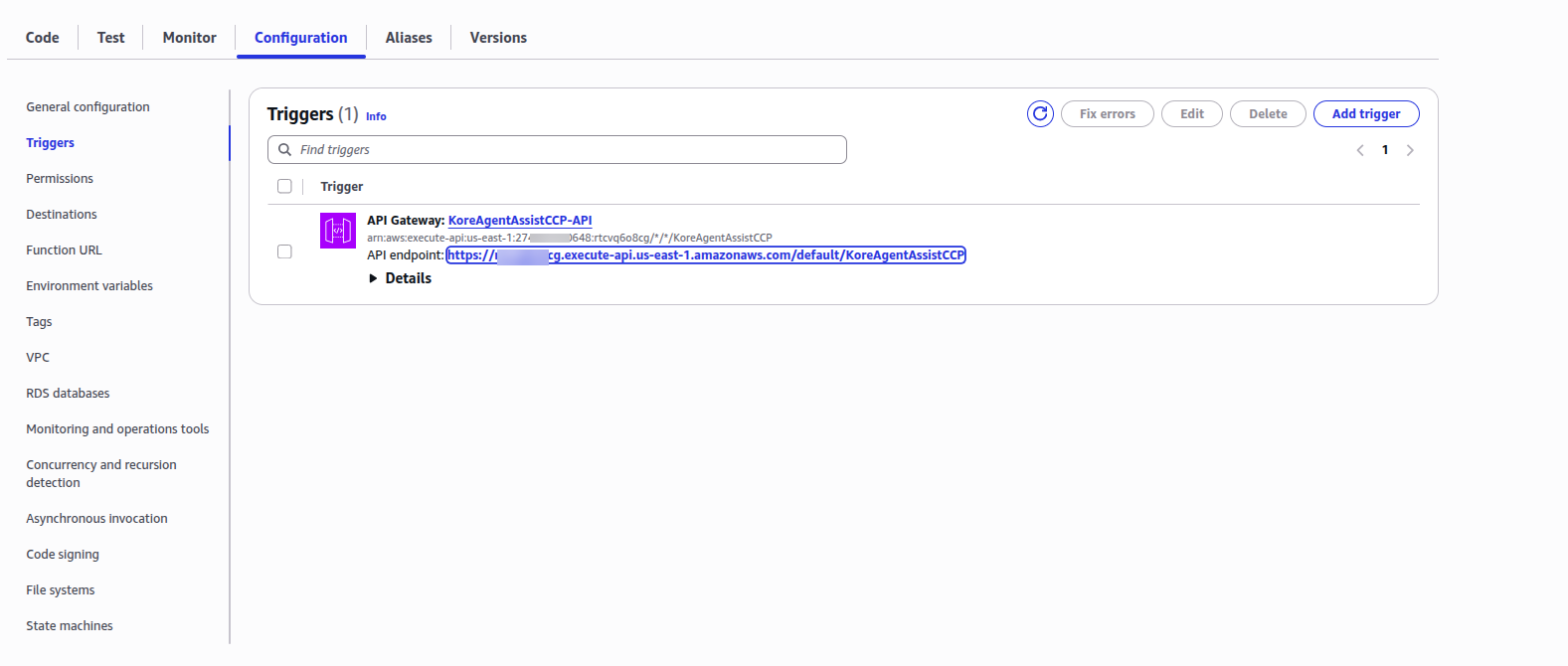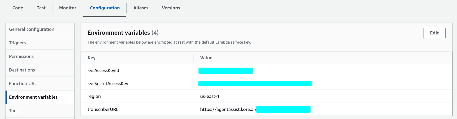 This function is responsible for returning all the credentials required to render the Agent AI widget on the Amazon Connect desktop. In this Lambda, you store all the required data in the environment variable and expose it to the API Gateway URL, which is used later in the CCP-voice configuration page.