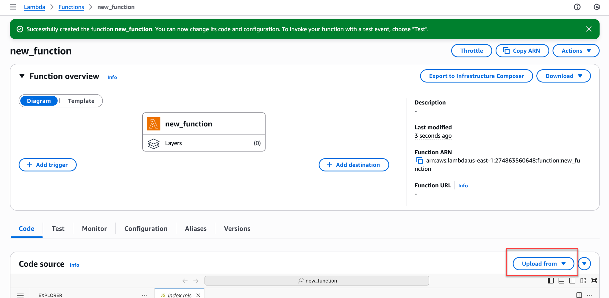- Download the Lambda from here and upload it to the function you create.