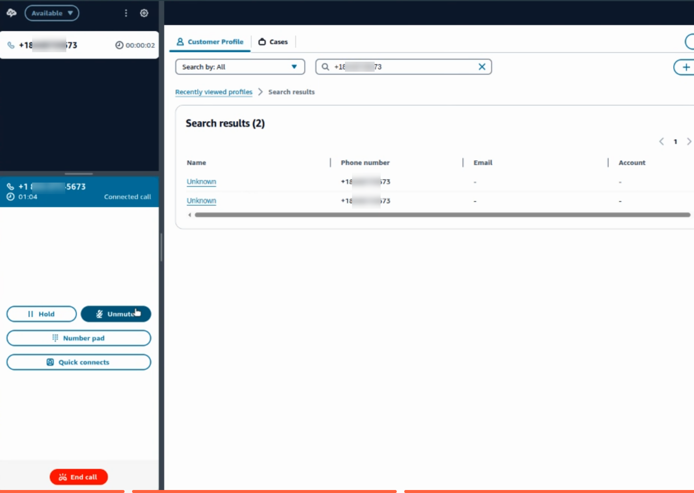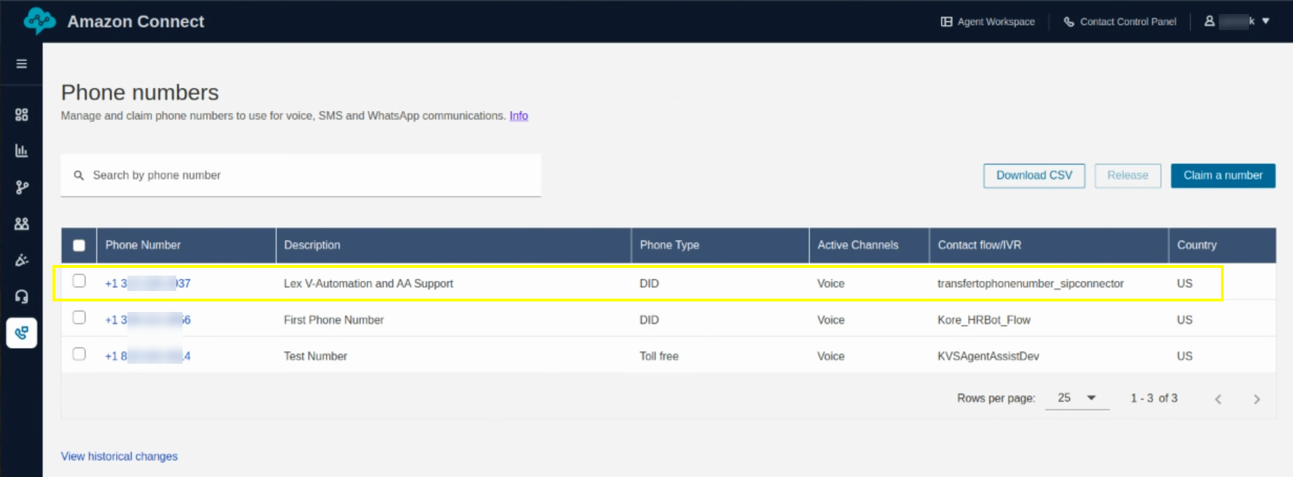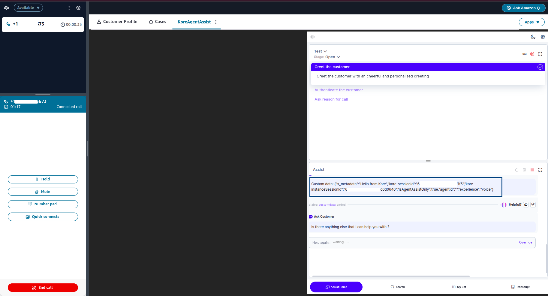 When you call the Amazon Connect number, the call routes to Kore Automation and, after agent transfer, returns to the Amazon Connect desktop.