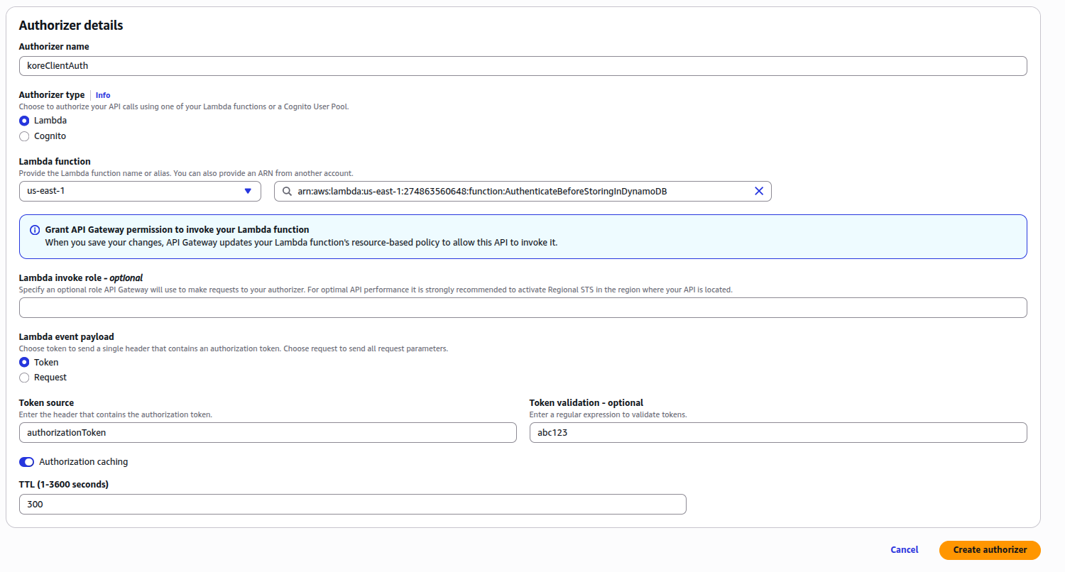 AuthenticateBeforeStoringInDynamoDB: This lambda function is used to add an authentication layer (Authorizer) on the API Gateway mentioned in the previous lambda function (koreStoreSessionMetadata). Copy and deploy the code from this link.