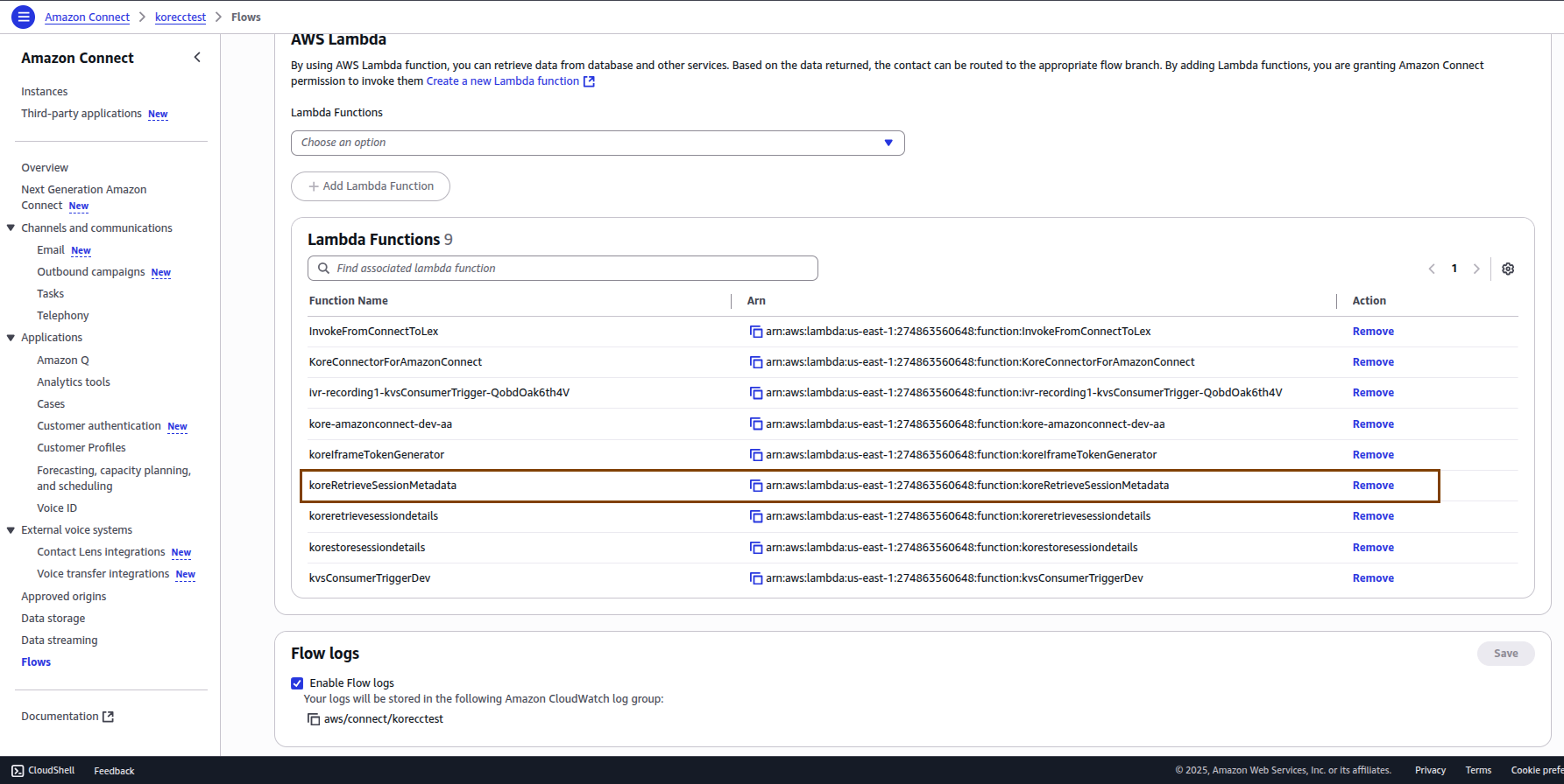 Open the Amazon Connect instance and add the last lambda function (koreRetrieveSessionMetadata) inside the flow.