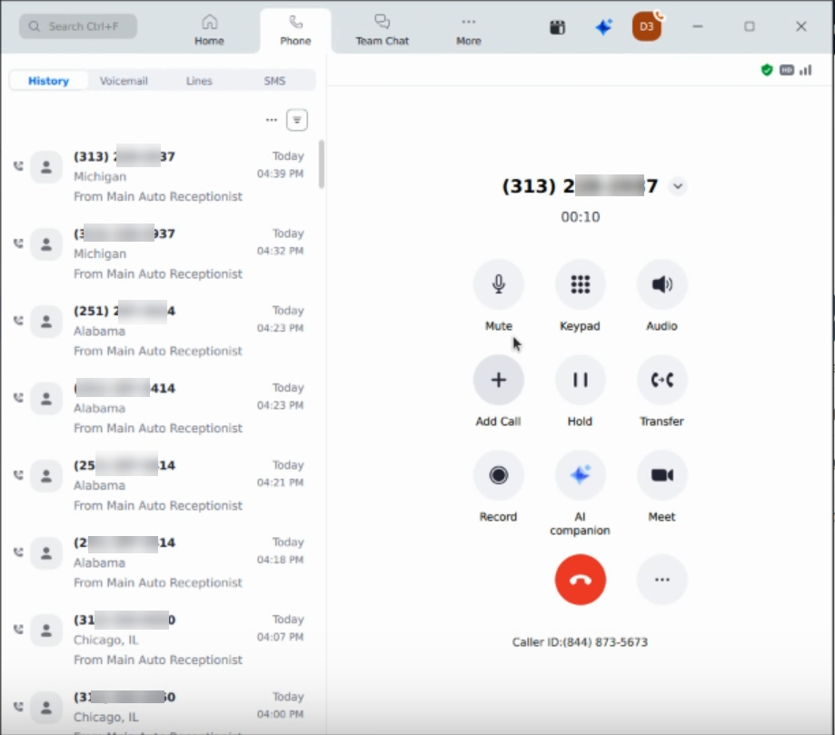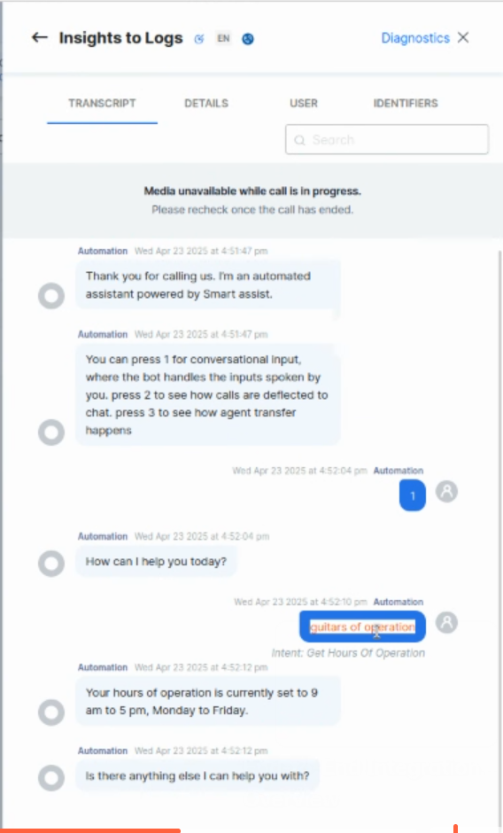 Kore CCAI handles the call. You can view the details of the call in the CCAI Dashboard > Interactions section.