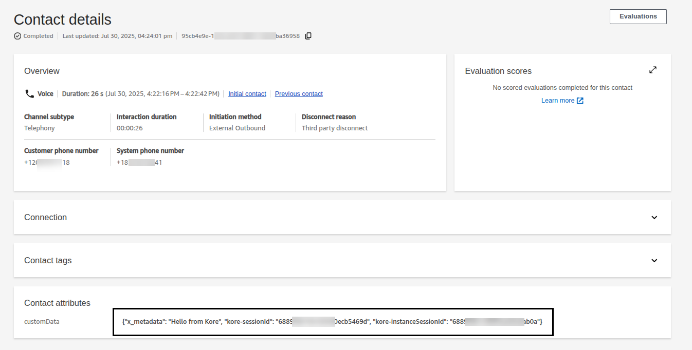 - To call this API, the Amazon Connect contact ID must be passed as one of the query parameters. This ID is retrieved from the SIP headers data sent from Amazon Connect to Kore.