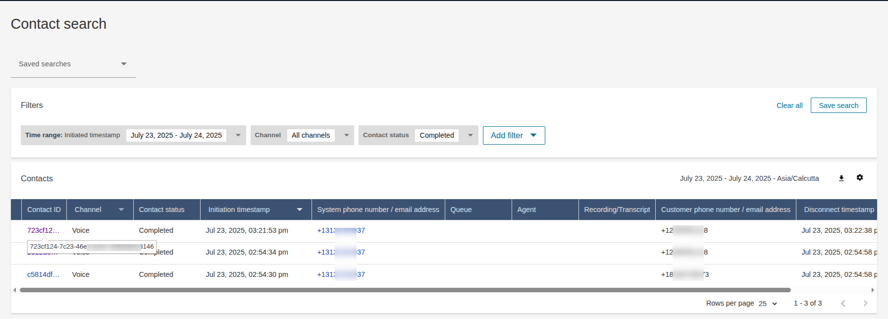 A list of conversations is displayed. You can also filter the results by contact ID.