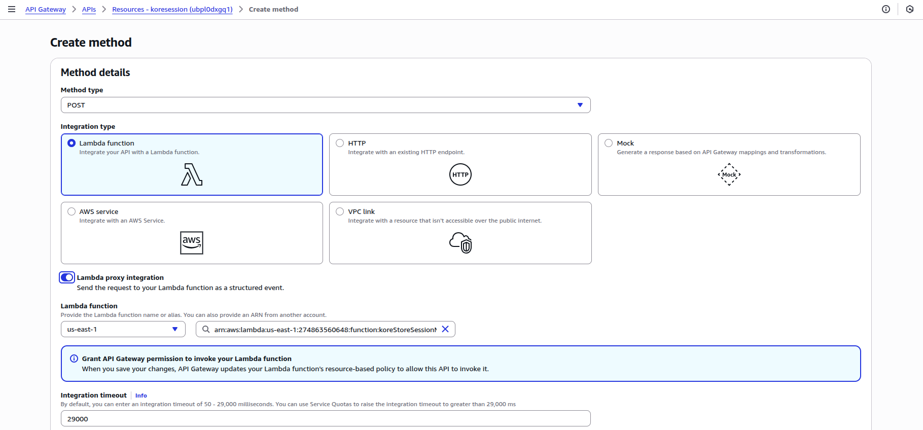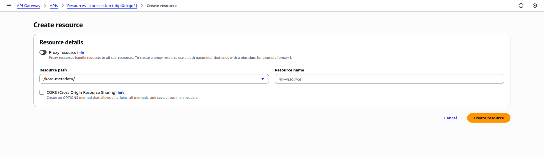 Create an API resource with the Resource path as “/kore-metadata.” Click Create resource: