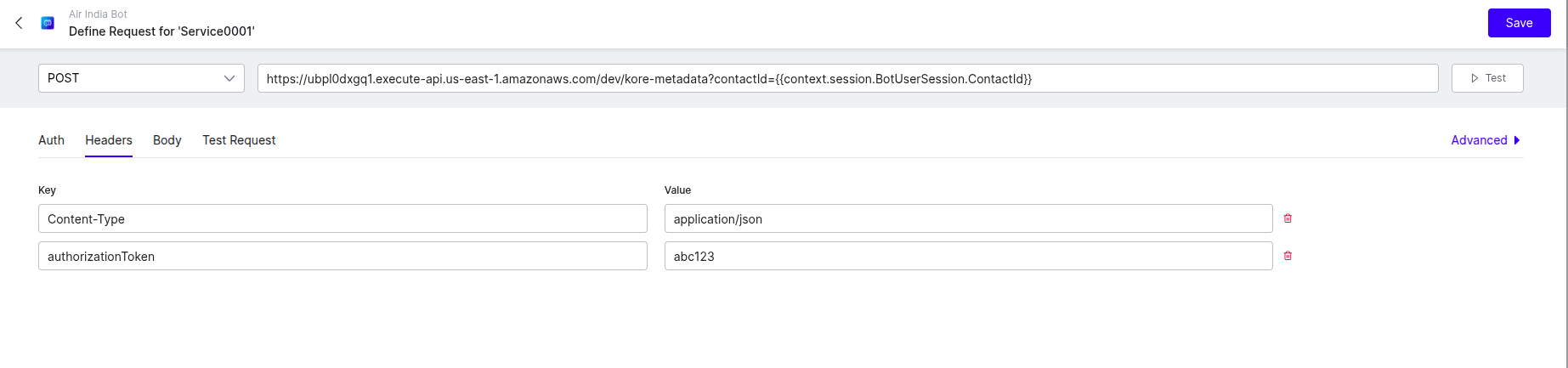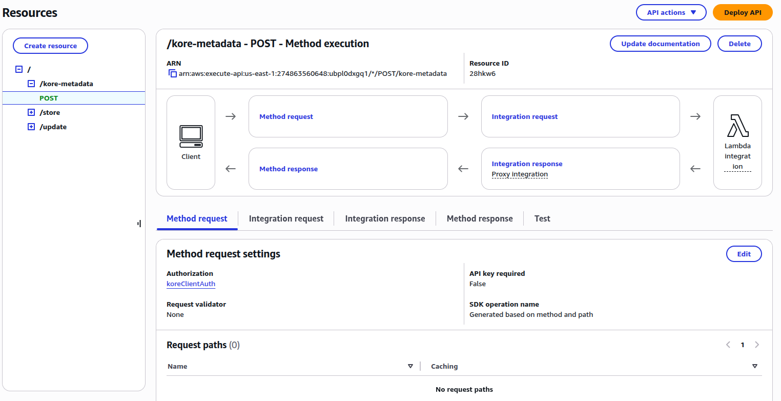 Add the Request URL: Add the API Gateway URL with contactId as query parameter. Get this by accessing your first lambda function (“koreStoreSessionMetadata”) > Configuration > Trigger.