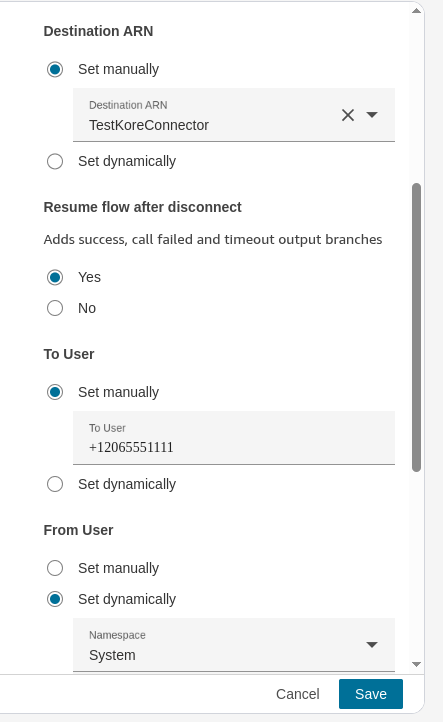 - Enable "Resume flow after disconnect": Set this option to "Yes." This step ensures that after the call ends with the third-party system (Voice Gateway), the call is transferred back to Amazon Connect, facilitating a continuous flow and correlation between Amazon Connect and the Kore system.