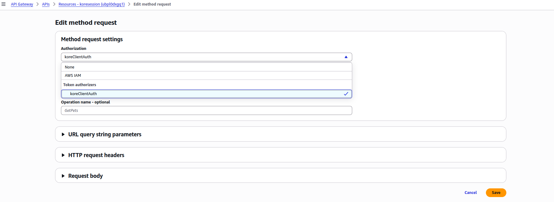 Once the koreClientAuth Authorizer is created, add this as part of authentication for the API Resource and method you created.