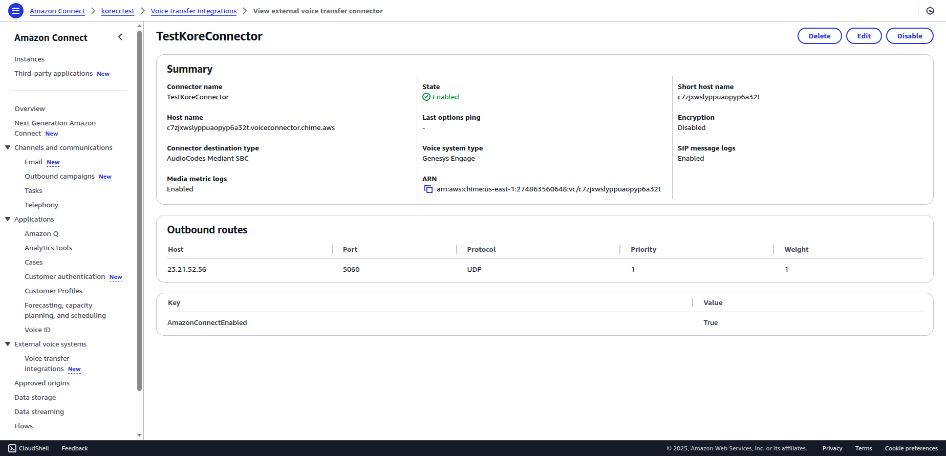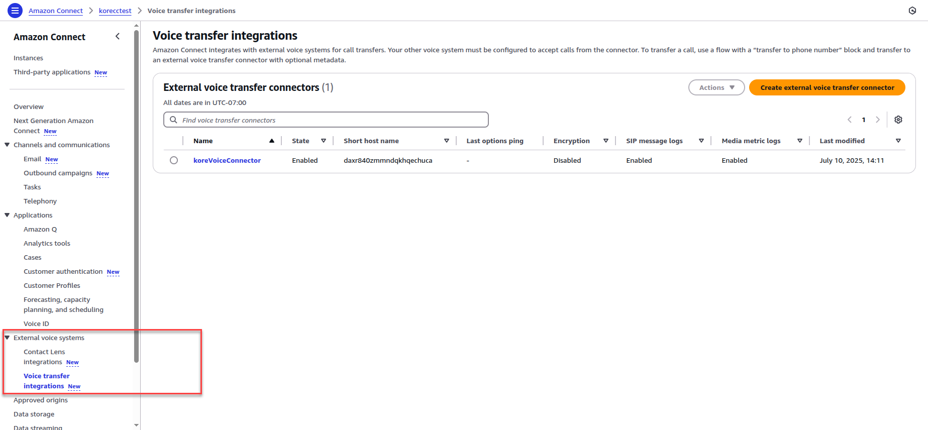 After enabling the feature, create a connector under Voice transfer integrations to link Amazon Connect with your Voice Gateway.