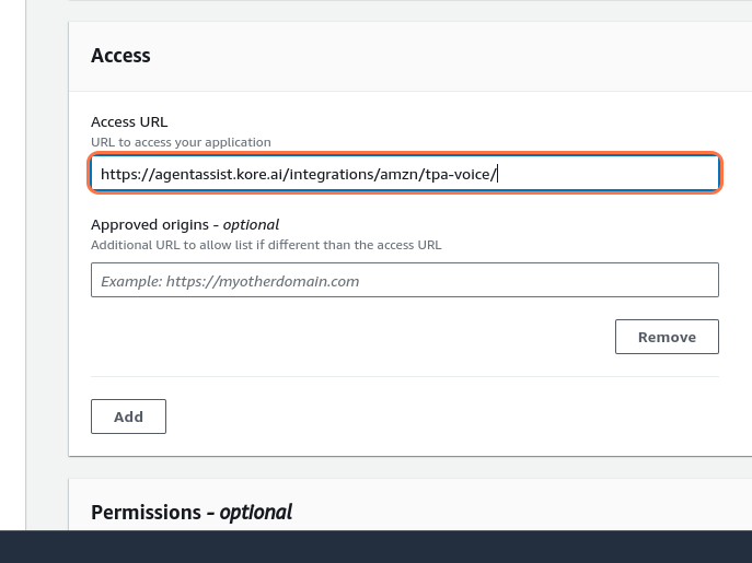 Enter https://agentassist.kore.ai/integrations/amzn/tpa-voice/ in the Access URL field.