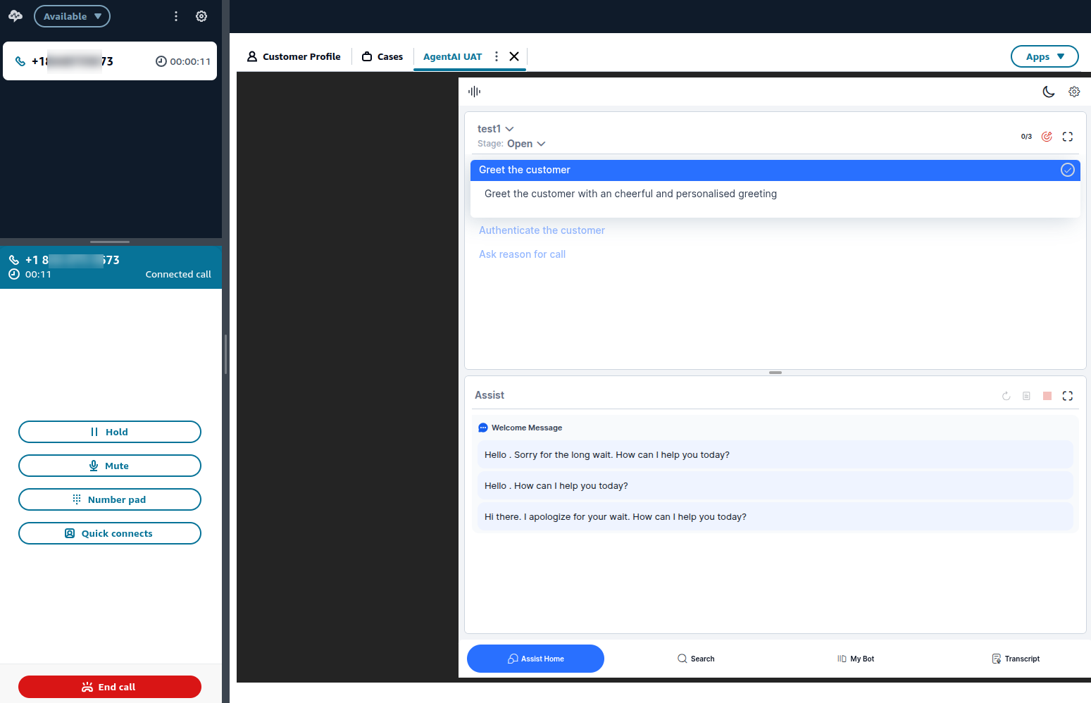 Call the Amazon Connect number. Once the incoming call lands into the agent desktop, accept it.