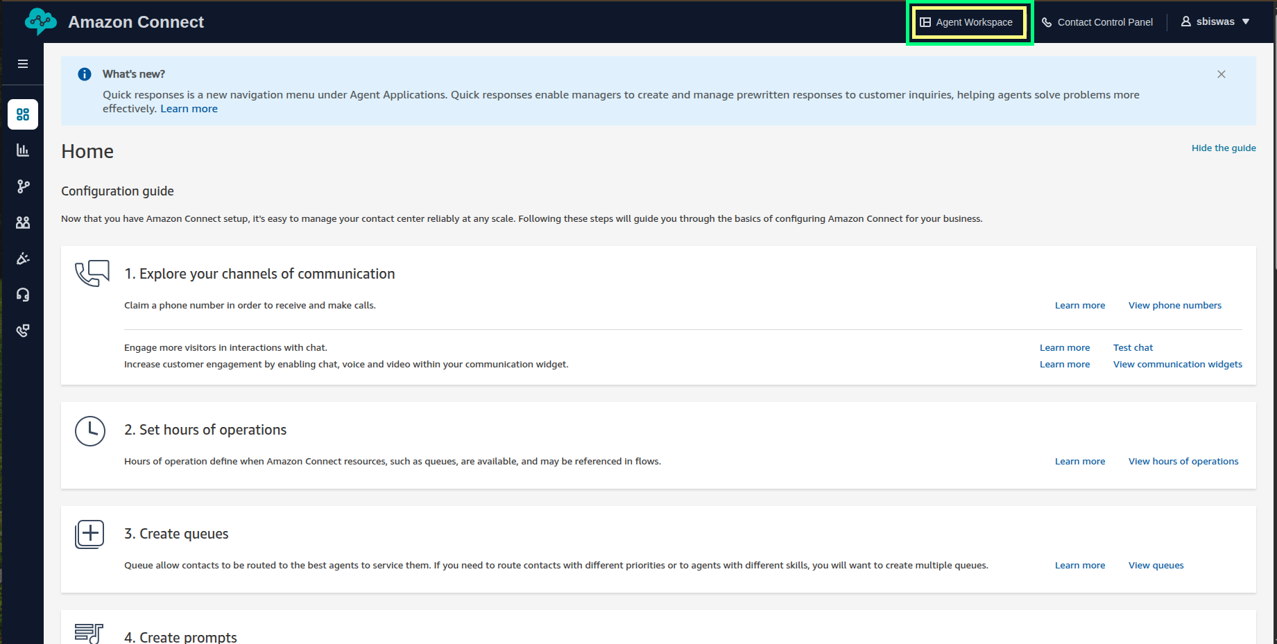 Open Agent Workspace from the home screen of your Amazon Connect instance.