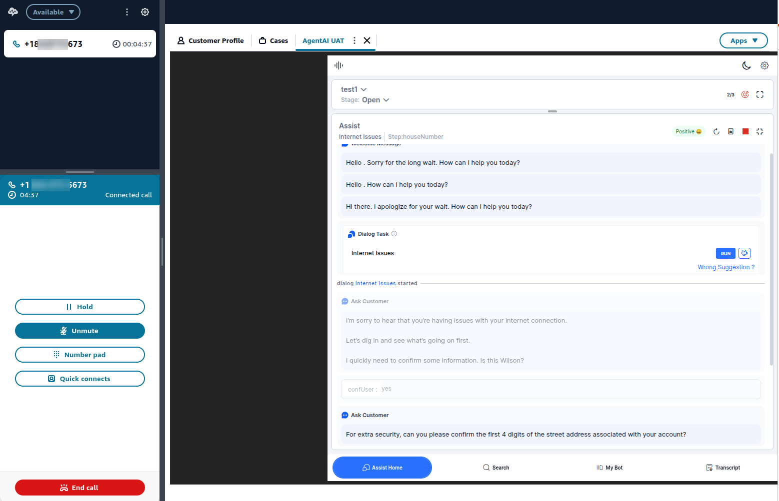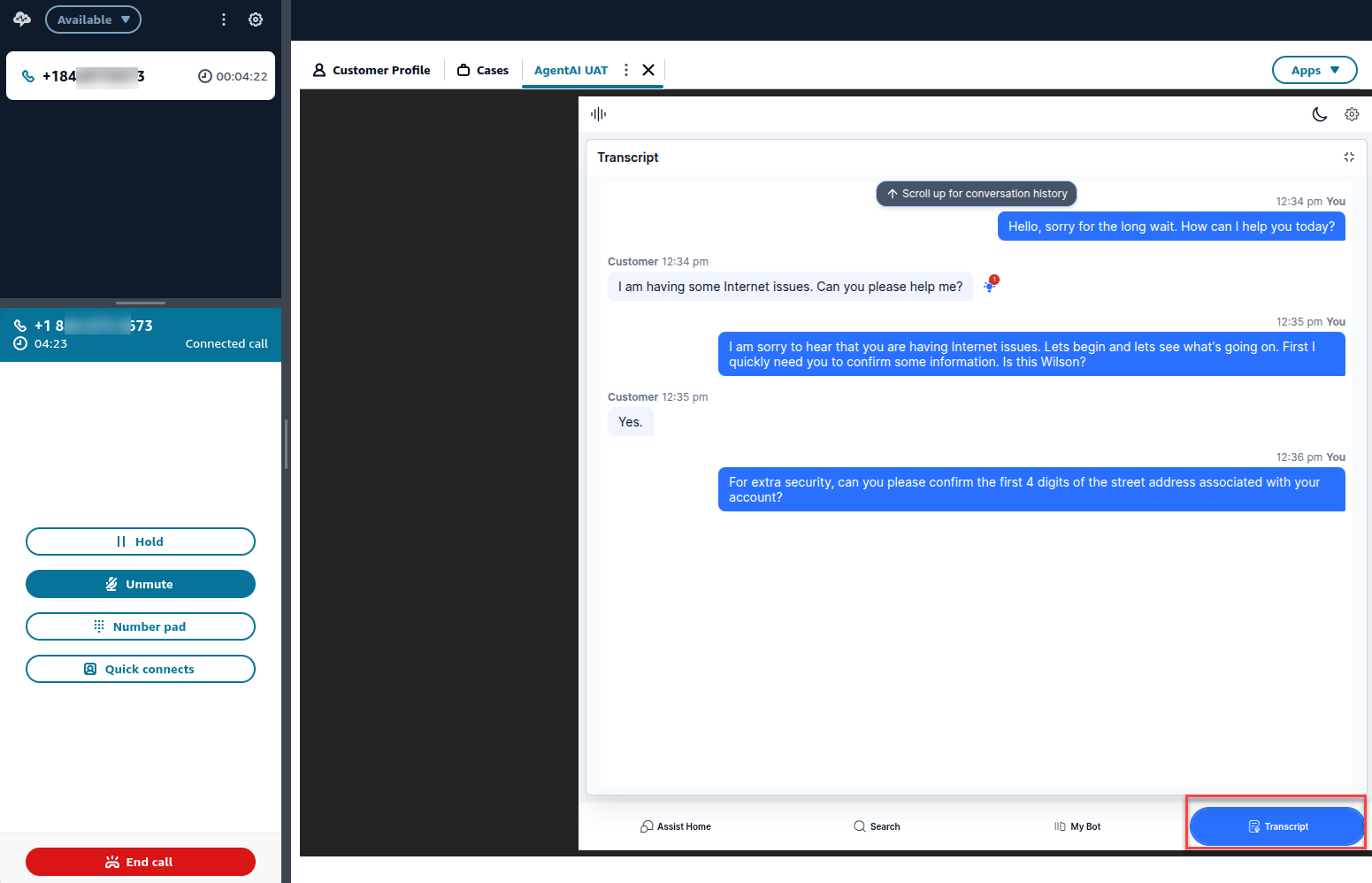 The Agent AI widget listens to all the user and agent conversation, and the transcript is visible on the Transcript tab of the widget.