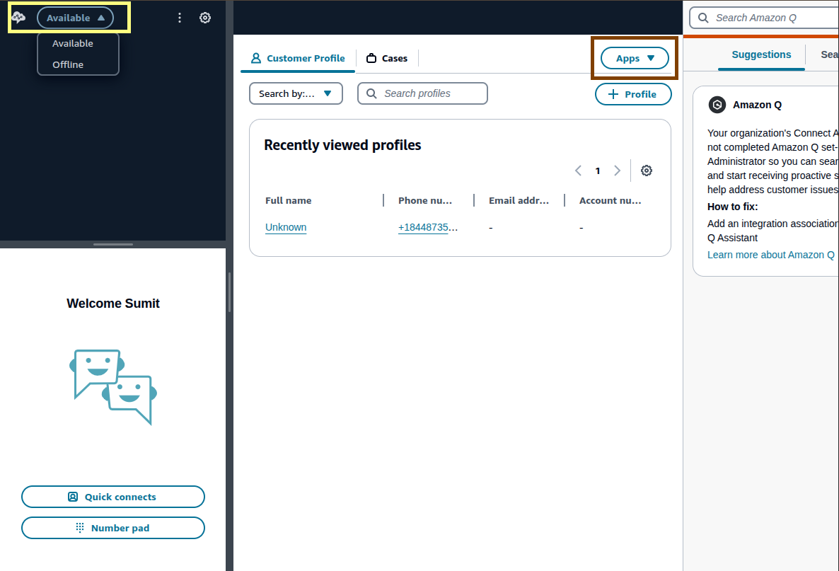 Change the agent status to Available. All the third-party applications created in the earlier steps will be visible on the right side under the Apps dropdown.