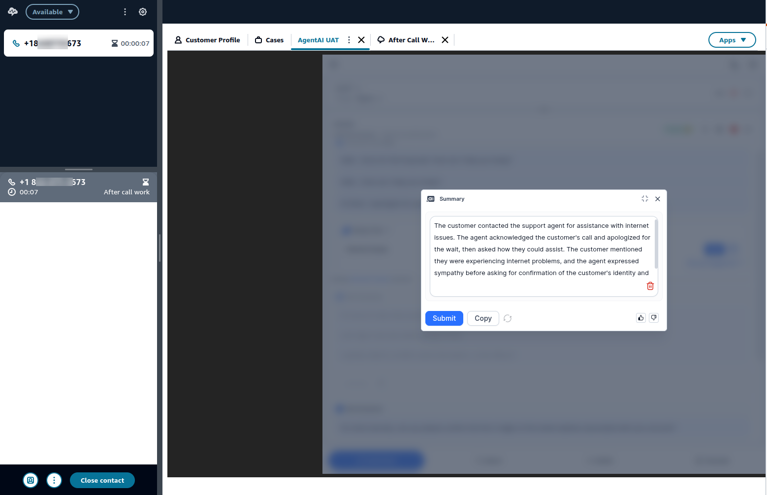 Once the call is disconnected, a call summary appears. The agent can modify the summary or copy it to save it into the CRM.
