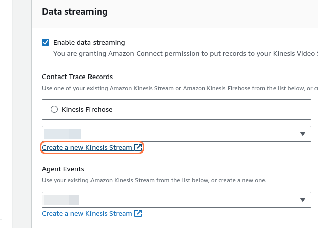 Click Create a new Kinesis Stream for this application, or select an existing one from the dropdown list. You can use the same stream for Contact Trace Records (CTRs) and Agent Events.