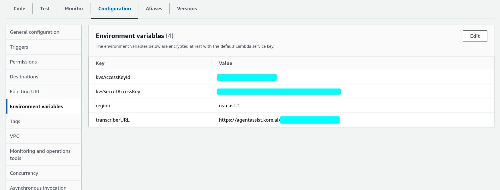 This function retrieves call stream metadata and AWS credentials from the environment, generates a credential set (SessionToken, AccessKeyId, SecretAccessKey) for KVS access, and triggers the Transcriber to send transcripts to the Kore AI Agent with the current Conversation ID.