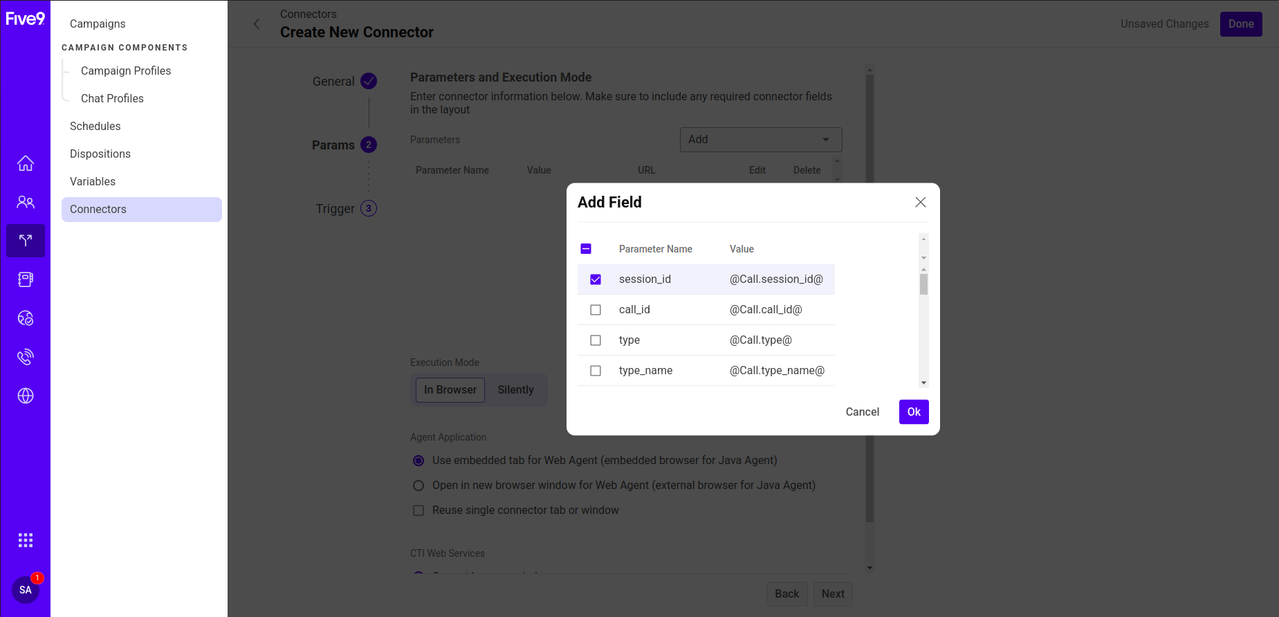 Select session_id, domain_id, id, skill_name/campaign_name (choose either skill_name or campaign_name, depending on which is used to map the bot in Agent AI), and click Ok.