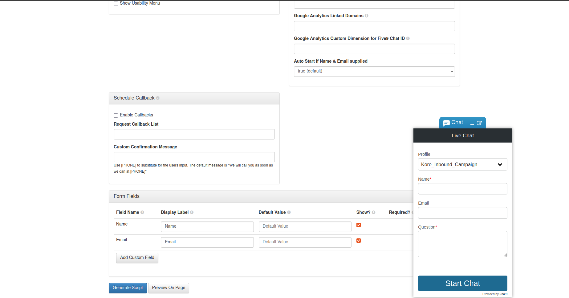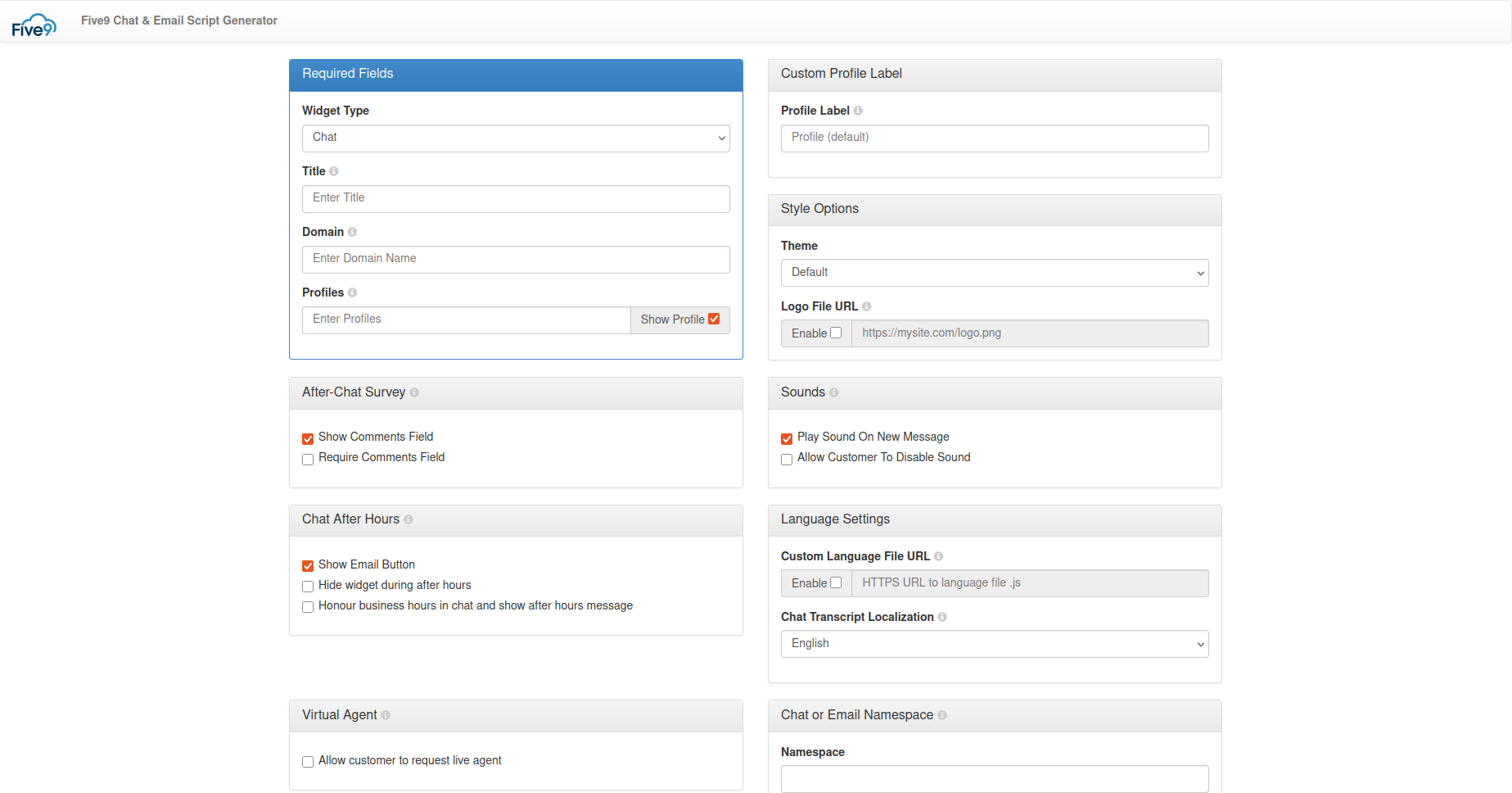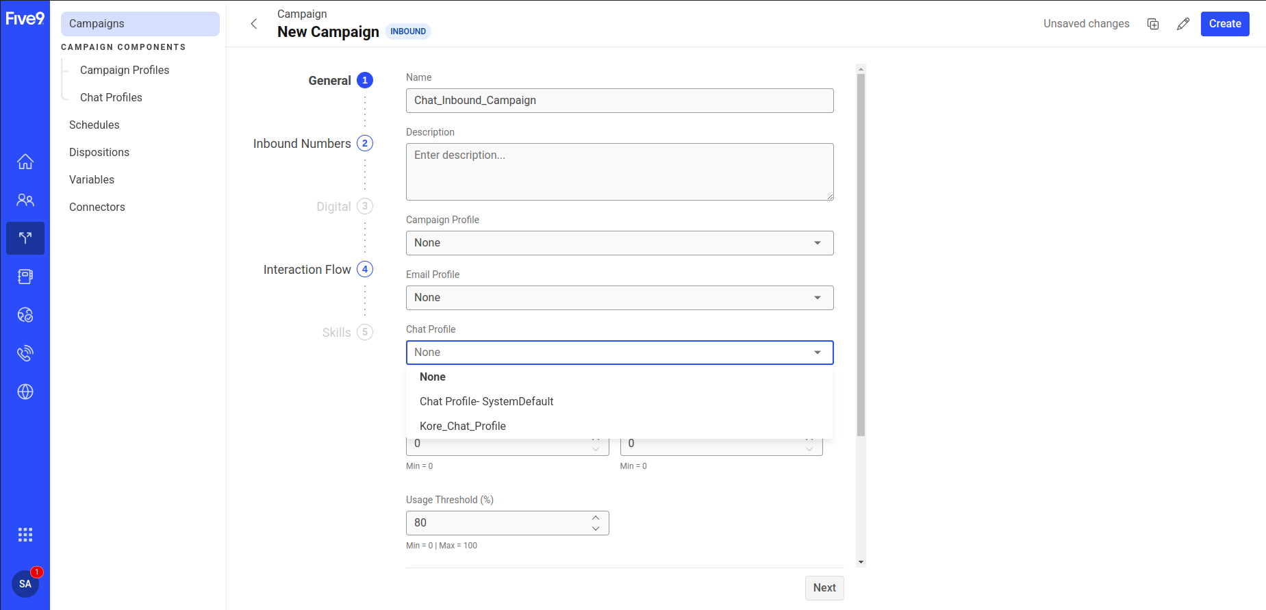 Enter your Five9 account domain name in the Domain field and the chat inbound campaign name in the Profiles field.
