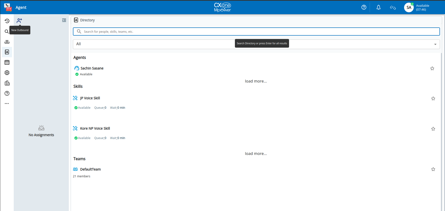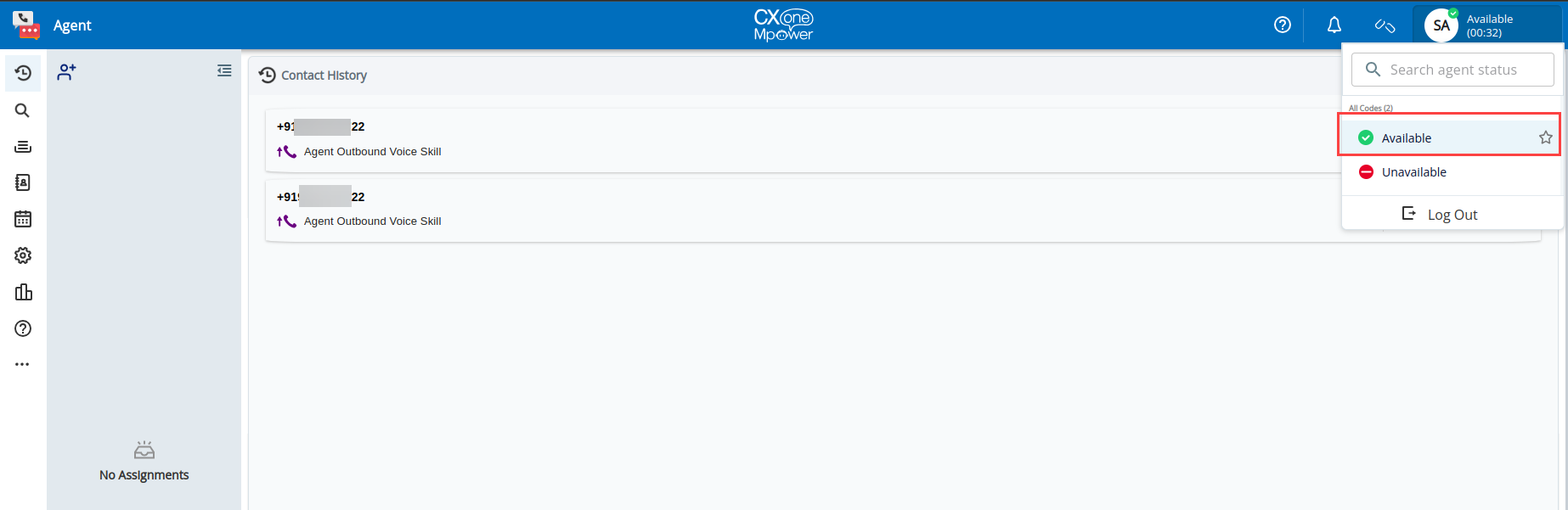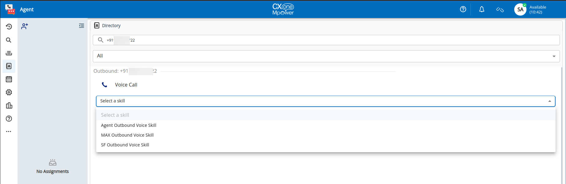 Enter a phone number in the search bar, select Voice Call, and select the outbound skill created in the previous step.