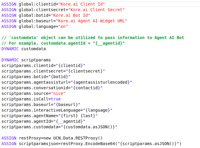- Custom Data: You can use the customdata object in the script to pass information to the AI Agent. At runtime, this customdata is accessible in the UserContext of the AI Agent. Refer to Access Custom Data in Agent AI Bot for instructions on how to access customdata in the AI Agent. Include your data in the customdata object (one key-value pair per line). For example: