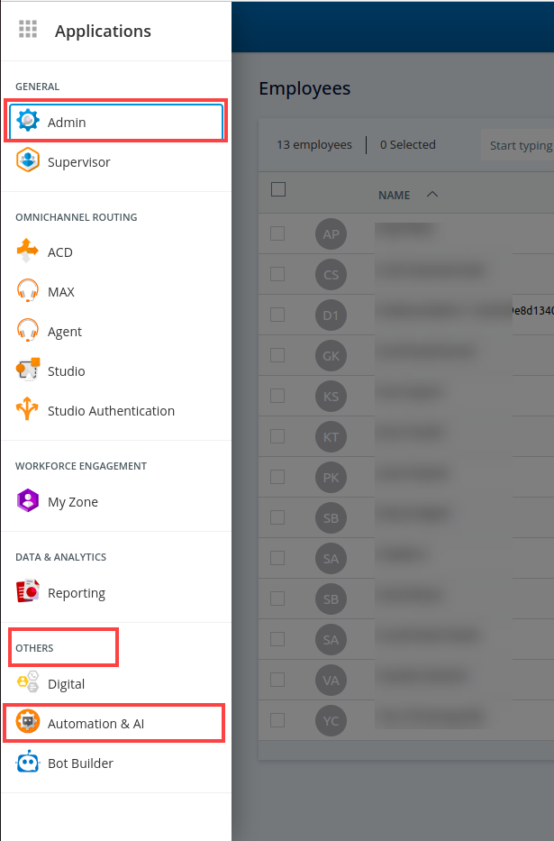 A menu opens from the left side of the page. Click OTHERS > Automation & AI.
