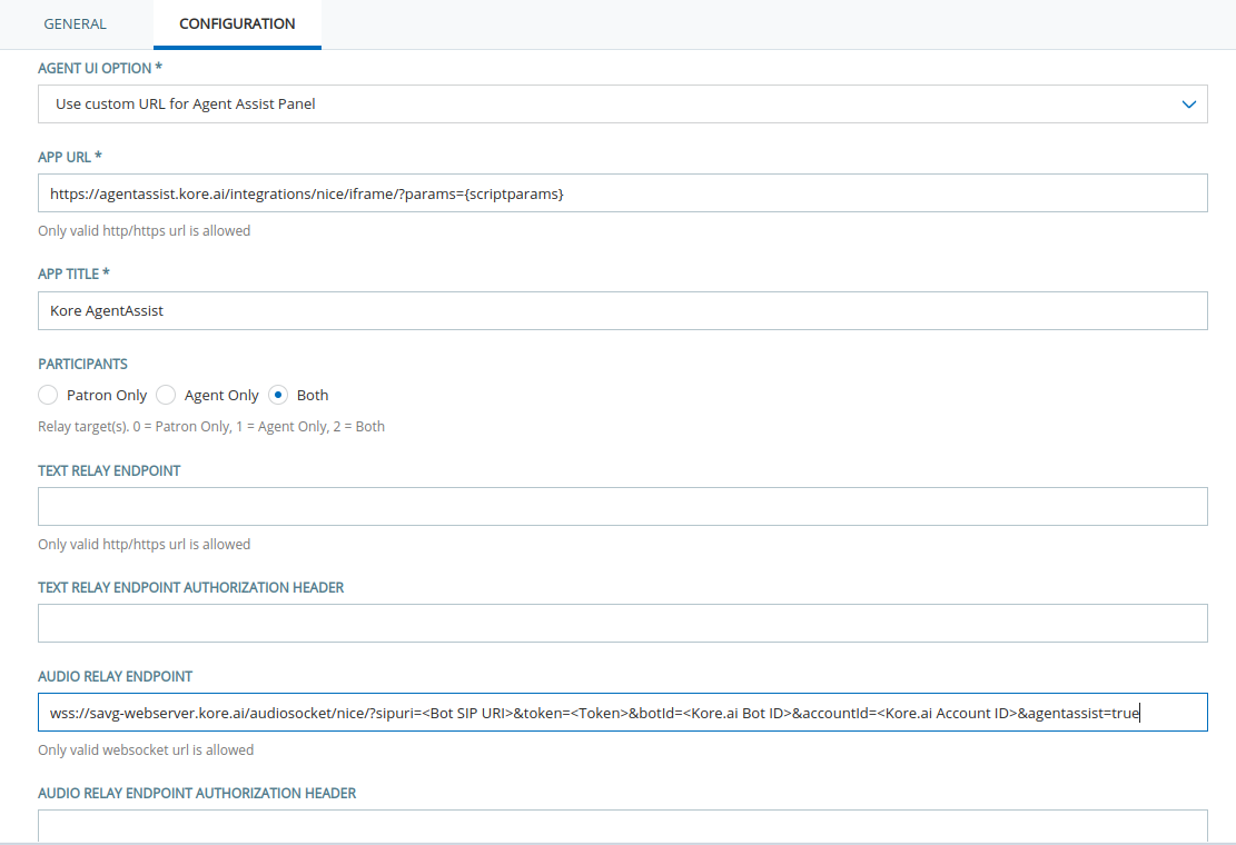 Audio Relay Endpoint: {[Kore Voice Gateway(KVG)]}/audiosocket/nice?sipuri=<Bot SIP URI><DNS>&token=<Token>&botId=<Bot ID>&accountId=<Account ID>&agentassist=true