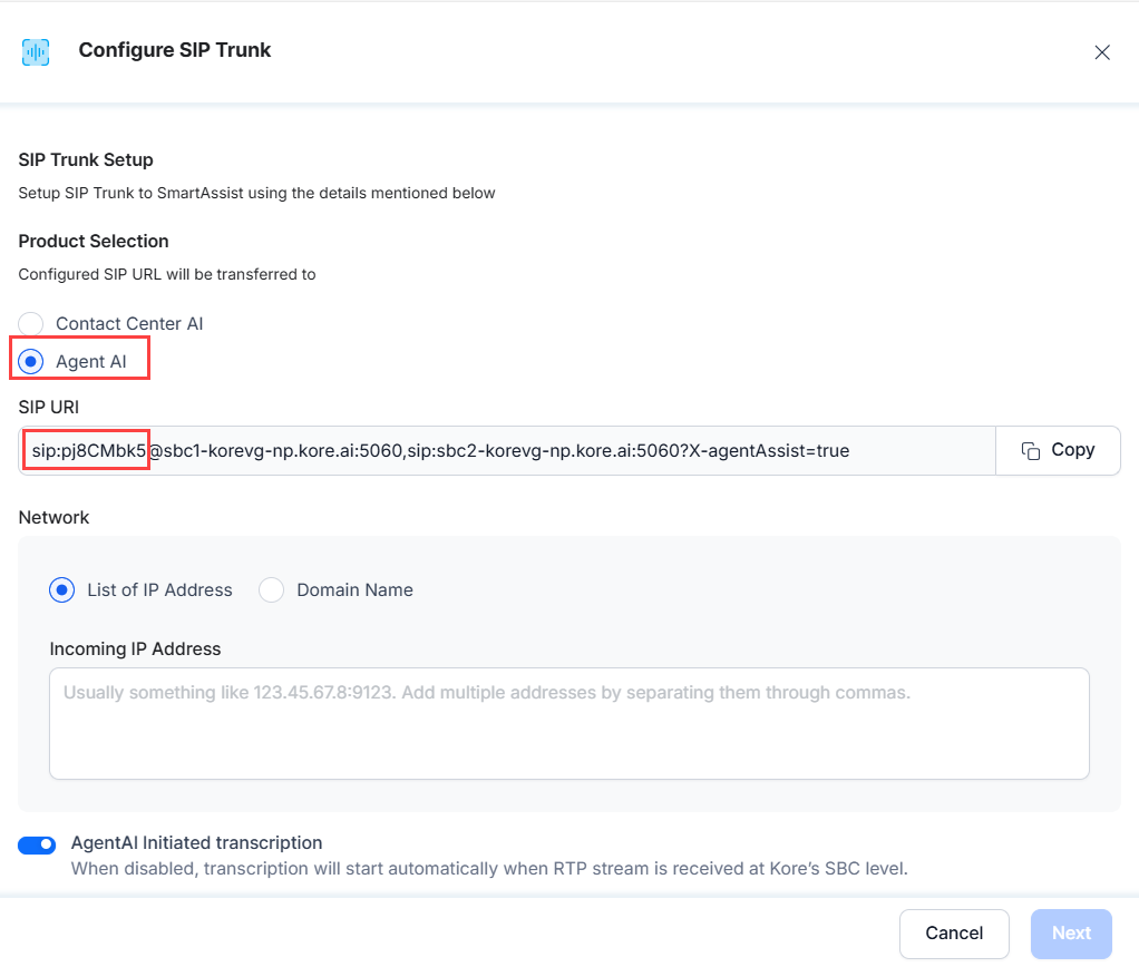 Bot SIP URI: Flows & Channels > Channels > Voice Gateway > SIP Numbers > Configure SIP Trunk > Agent AI section of the Agent AI configuration portal.
