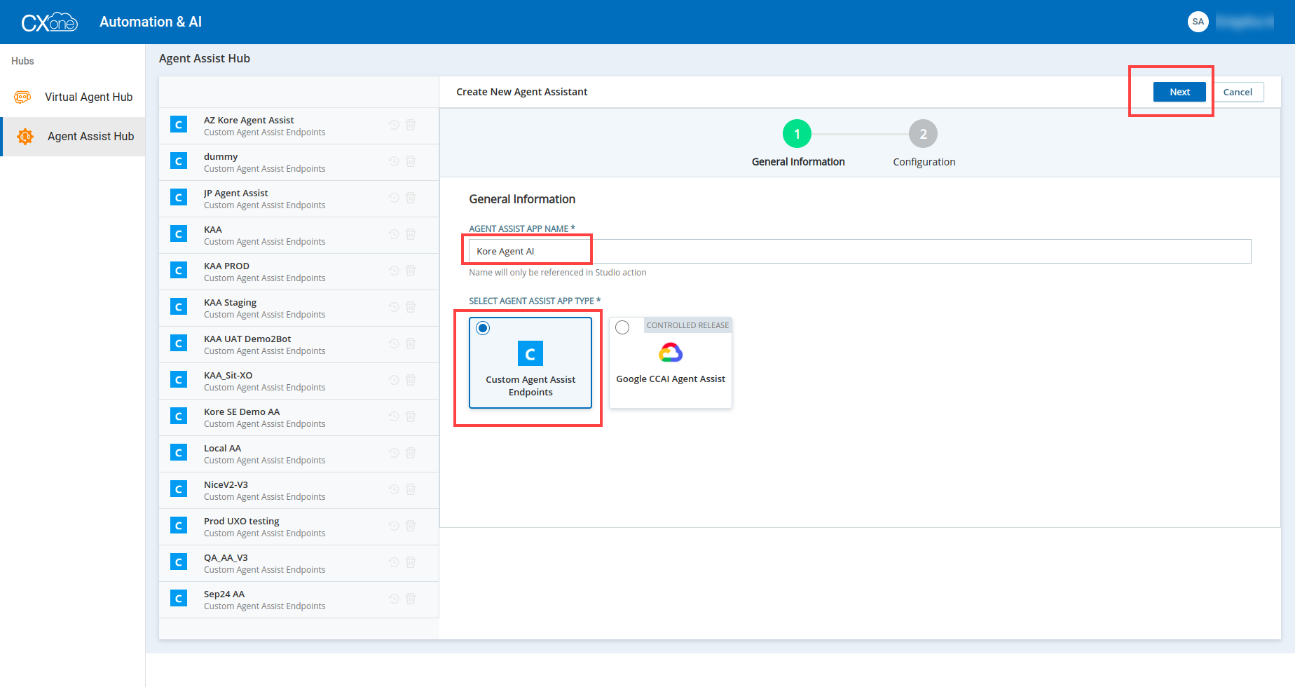 - Step 1: Nice CX Integration Hubs > Add Agent Assist Hub