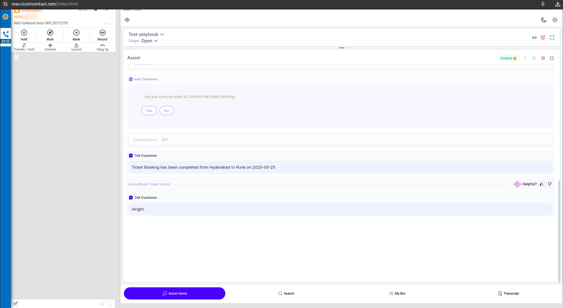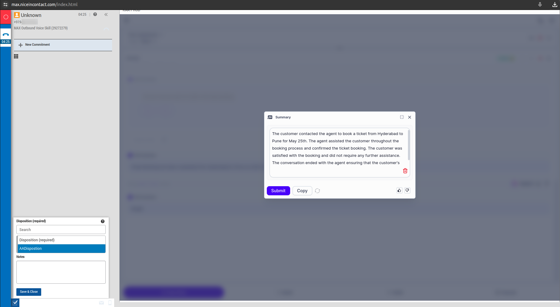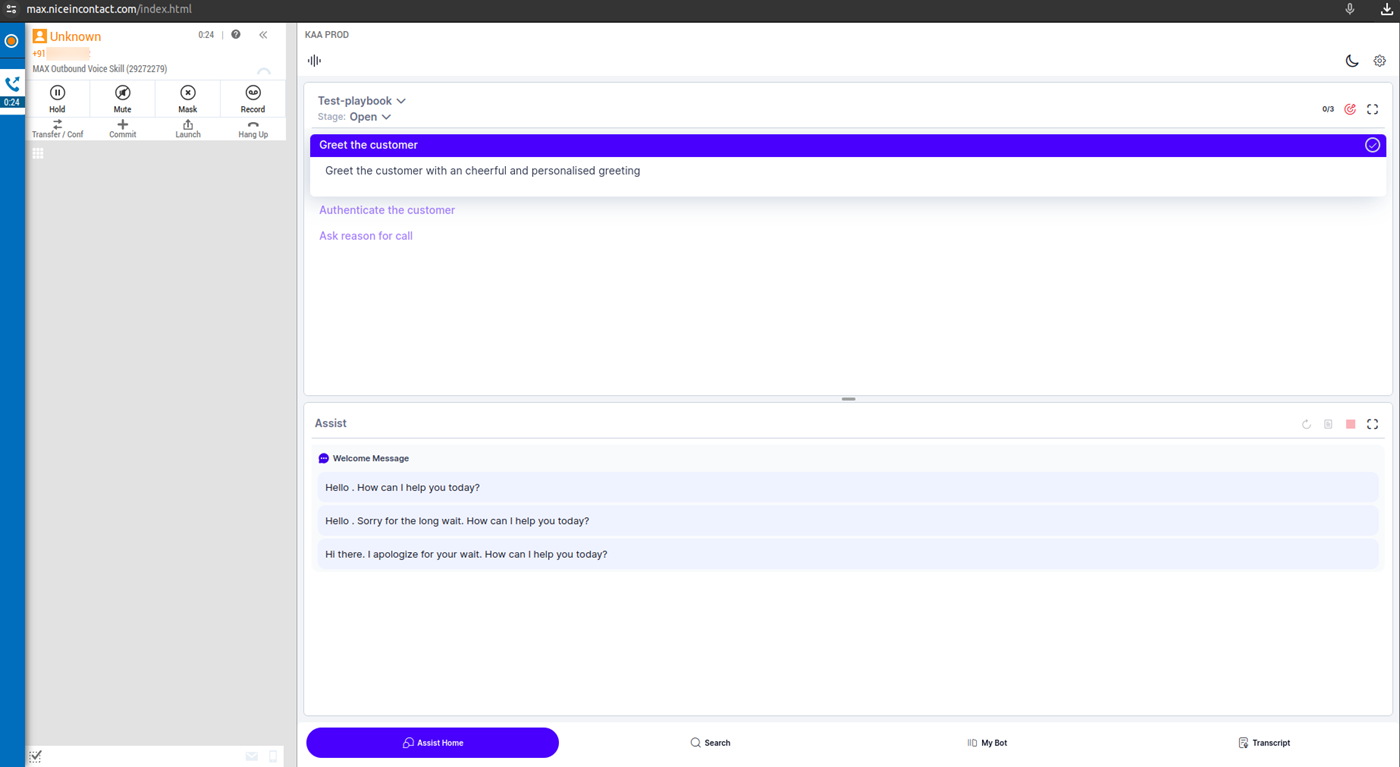 This document provides step-by-step instructions for integrating the Kore.ai Agent AI widget into the NICE MAX Desktop environment. This integration enables key Agent AI features such as Automation, Agent Coaching, Agent Playbook, Sentiment Analysis,Transcription, along with end-of-call summary and Custom Data passing (such as agent name and ID) to the Agent AI widget.
