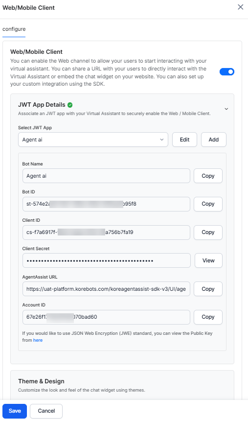 Bot ID and Account ID: Flows & Channels > Channels > Digital > Web/Mobile Client > JWT App Details section of the Agent AI configuration portal.