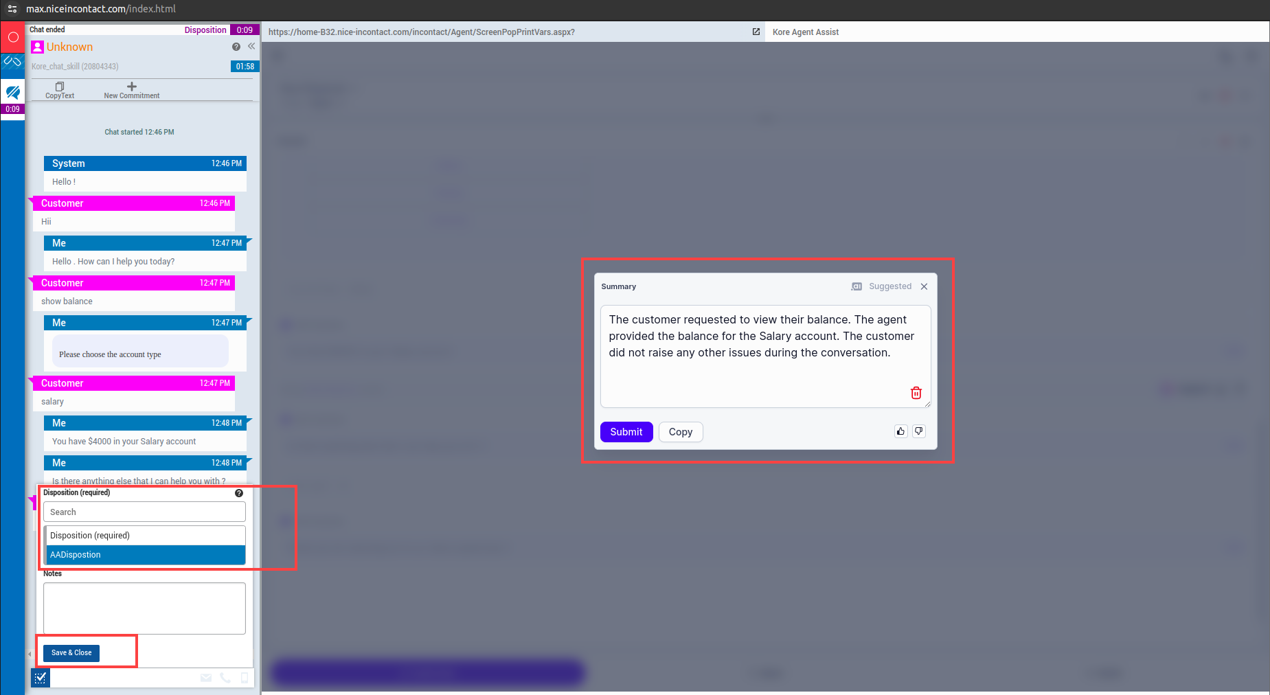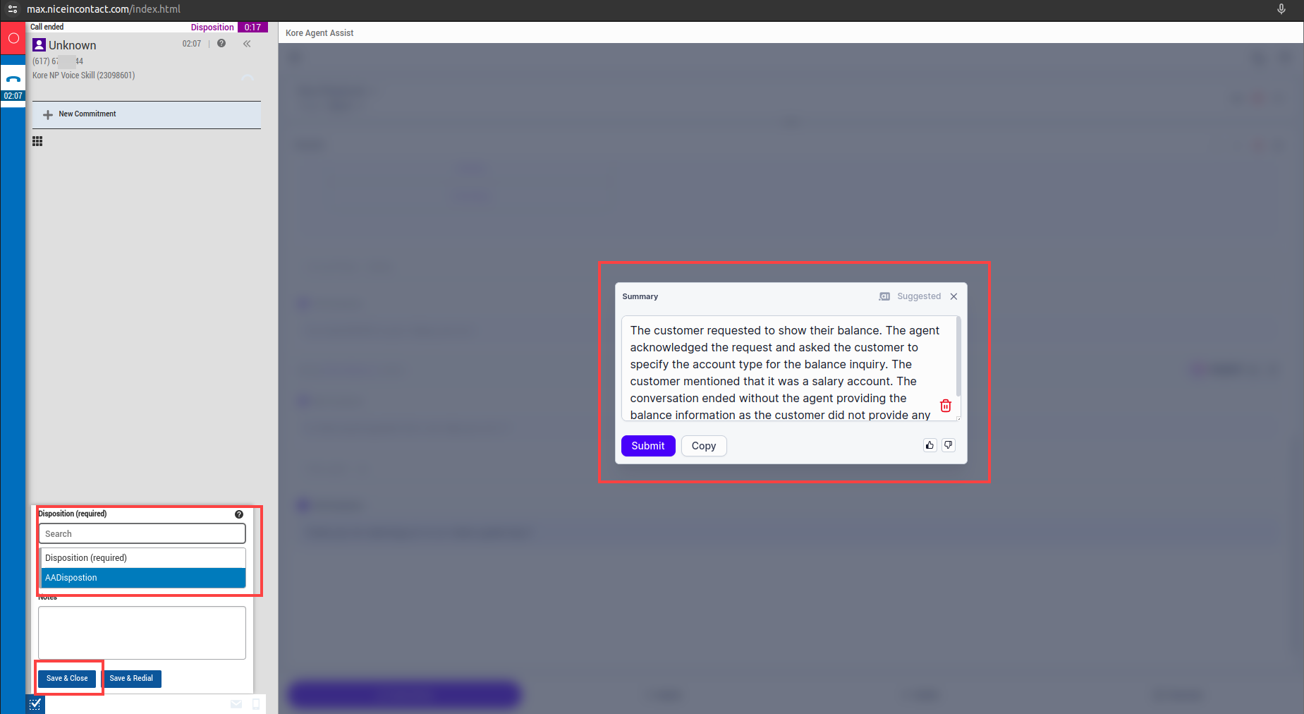 To view the summary pop-up in the Agent AI widget, you must assign a disposition to the skill. If you don’t, the chat/voice screen automatically closes once the session ends.