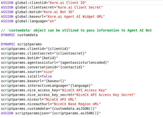 Custom Data: The customdata object in the script can be used to pass information to the Kore AI Agent. During runtime, this custom data will be accessible in the UserContext of the AI Agent. Refer to Access Custom Data in Agent AI Bot for instructions on how to access custom data in the AI Agent.