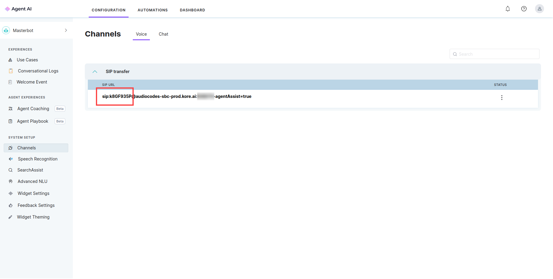 Bot SIP URI : Channels > Voice section of the Agent AI configuration portal.