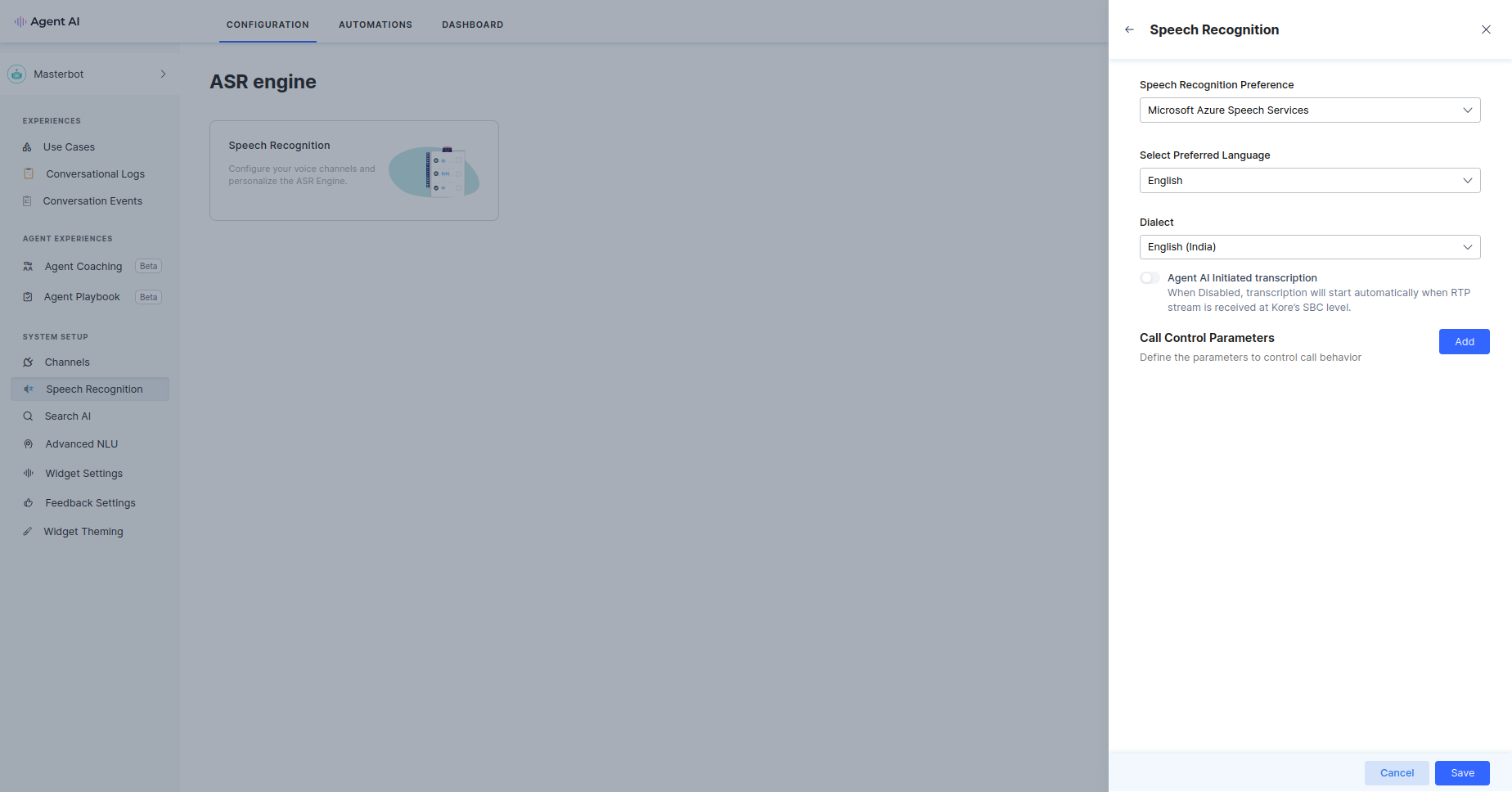 Use Case: Display voice transcripts and suggest next best actions from a configured AI Agent on the Kore Agent AI widget when agents place customer calls.
