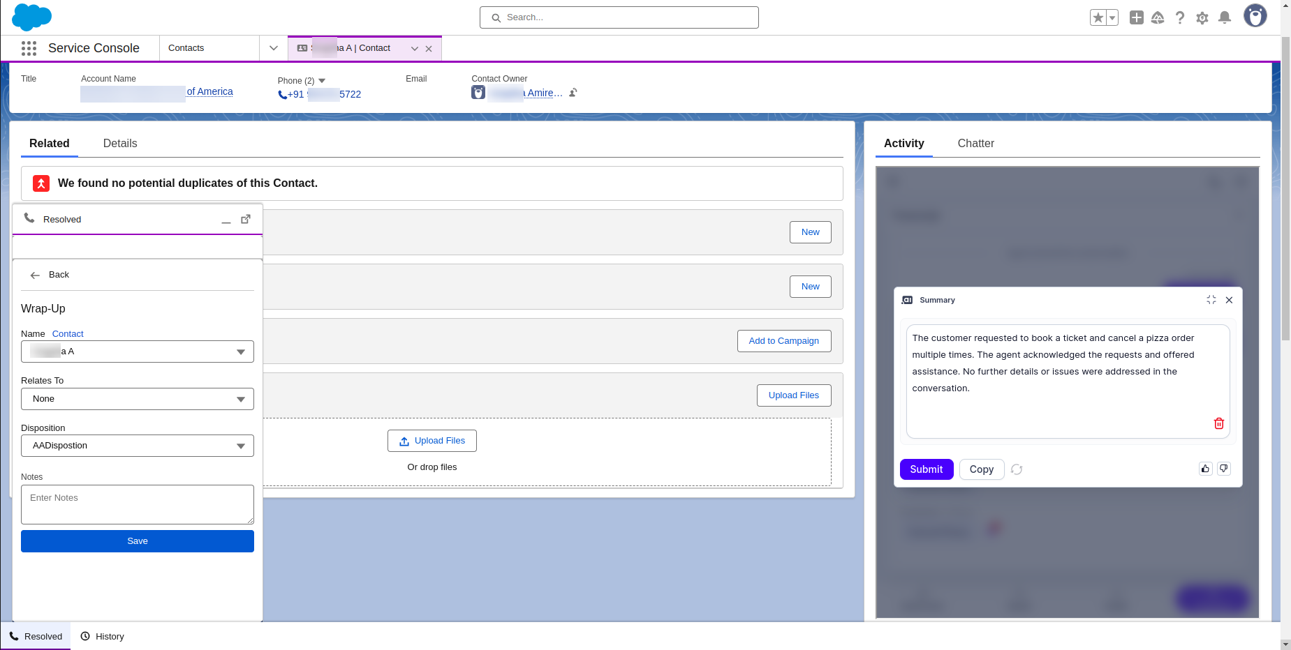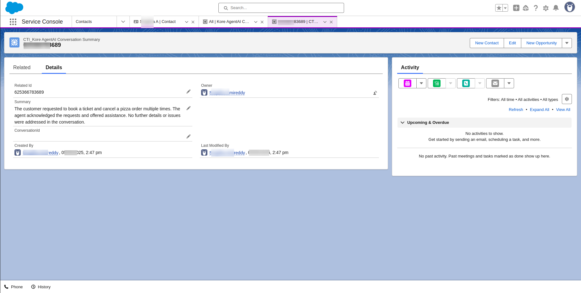When agents place customer calls, based on the customer’s phone number CTI rule matches the corresponding Salesforce object (such as Account/Contact/Case) and displays to the agents. The voice stream is shared with Kore Voice Gateway, which in turn generates transcripts of the voice stream and displays on the Agent AI widget embedded into the matched Salesforce object.