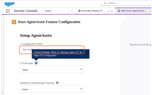 If the Agent AI widget is embedded within the Salesforce popup page configured in Softphone Layout, Agent AI Initiated Transcription must be disabled for transcription to work correctly. This is because the widget loads before the customer accepts the call, and the audio stream is sent to Kore only after the call is accepted.
